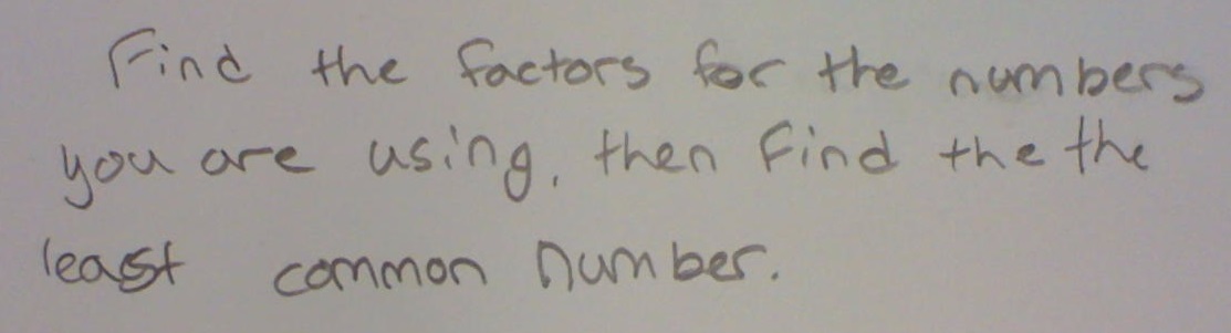 Interesting algorithm, and would be see how students repond to it and/or synthesize the steps. Usually when I do this activity, I am about to start adding/subtraction rational expressions, and think about LCD’s of pairs like 6x^2y^3 and 8xy^4. As such, I want to get them thinking about factors and the need to select the highest power of each factor.