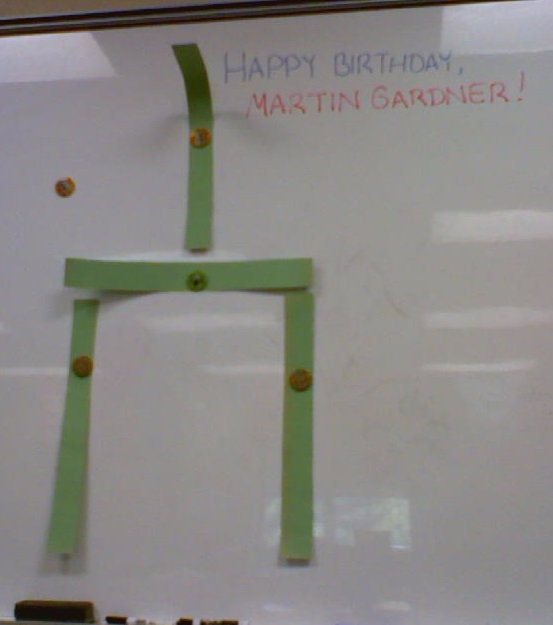 Sometimes class openers have nothing at all to do what is happening in class, and are meant to generate positive math vibes, or think about ideas beyond the confines of curriculum. Today my classes celebrated the 100th birthday of Martin Gardner, the long-time master of the math challenge. His birthday would have actually been last month, but better late than never to enjoy some math puzzlers, these from a 2011 edition of Scientific American, where his problems were often published. Many similar problems appear online, and can be easily found through searches.