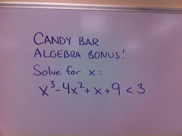So, the problem on the board when students walked in was intended to see if yesterday’s discussion could transfer to new ideas. Would my students now be able tackle a more difficult problem, or a problem with a similar theme from another chapter – like the polynomial problem I gave as a bonus? Would they impress me with their ability to analyze the inequality?