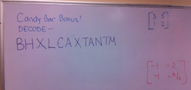 Clearly this isn’t much of a hint, as there are an infinite number of coding matrices to consider. But take a look at that original photo again….what’s that matrix lingering in the darkness? To code my message, this matrix method (called the Hill Cipher) was used, and my coding matrix was provided all along. This still provides a challenge to students who are new to inverse matrices, but before we departed I did show my class a Hill Cipher applet which I used to code my message, and which verifies the original message.