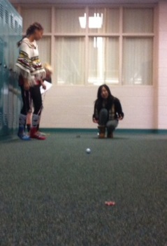bocce2In hallway bocce, students place two poker chips 5 meters apart in the hallway. Then, standing behind one of the chips, they roll a golf ball towards the opposite chip, trying to get as close as possible. With our carpeted hallways, the golf balls really take off, so some practice is needed to get the right touch. During this practice session, the students don’t know where this is all heading in terms of experimental design.