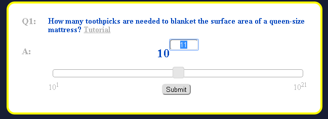 Students really got into the estimates, and I enjoyed listening to them argue their position with neighbors while attempting to estimate unknown quantities. I facilitated the group-think by moving the slider based on loud “higher” or “lower” from the group, until it seemed we were satisfied. The site then gives you a result and a score based on how close you were. There are a few thousand questions on the site, and we got through about a dozen today before settling into class.