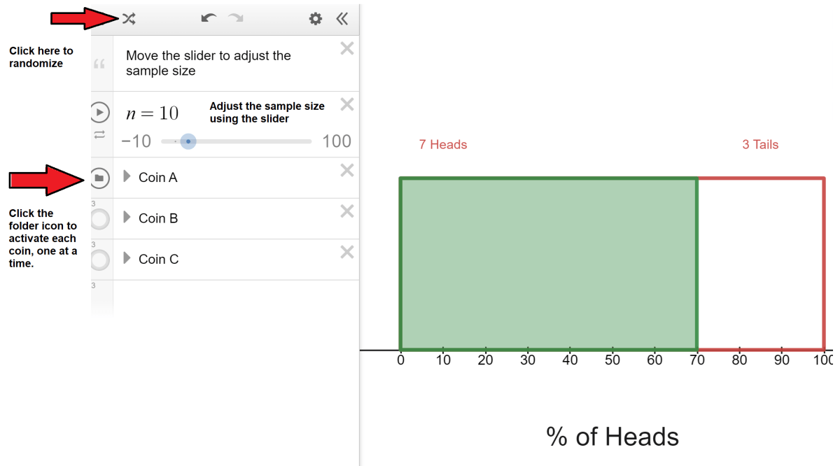 In this activity students will investigate the “fairness” of 3 virtual coins through a Desmos graph, using 3 different sample sizes to compile evidence. For each sample, students use their graphing calculator to compute a P-value and then reach a statistical conclusion. For coin A, I led students through the steps for n=10 and encouraged them to work through the next two sample sizes using their group-mates as a support system.