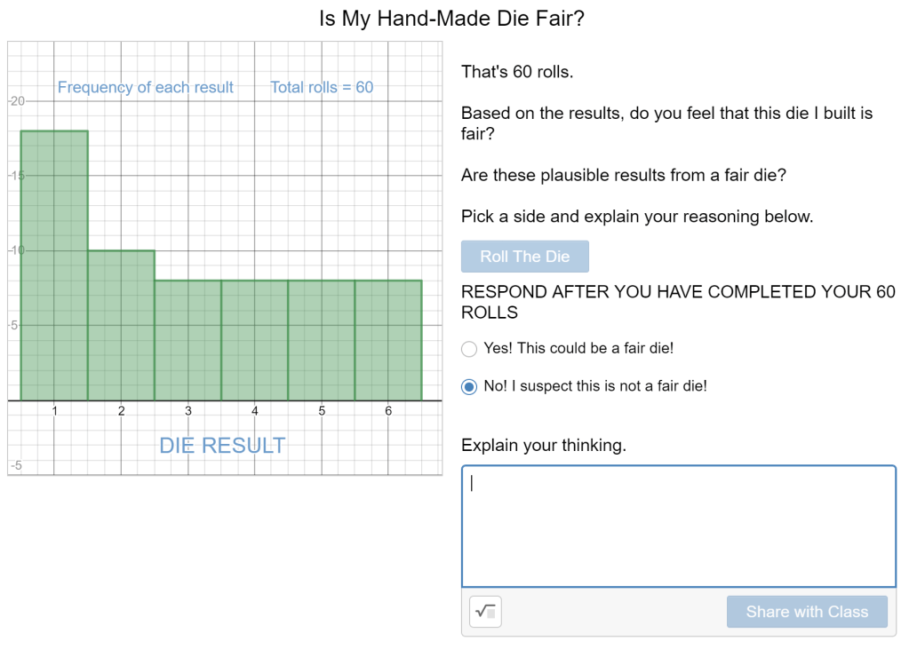 In this activity students will investigate the “fairness” of 3 virtual coins through a Desmos graph, using 3 different sample sizes to compile evidence. For each sample, students use their graphing calculator to compute a P-value and then reach a statistical conclusion. For coin A, I led students through the steps for n=10 and encouraged them to work through the next two sample sizes using their group-mates as a support system.