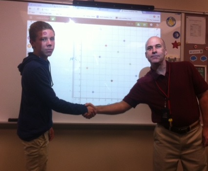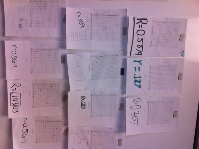 From there, students learned how to use graphing calculators to analyze the data – making the scatterplot and finding the best-fit line. The partnerships also wrote this mysterious new statistic – r – on the bottom of the graph and shared their graph in the board. Through a gallery walk, the class examined the graphs and tried to conjecture the meaning of r.
