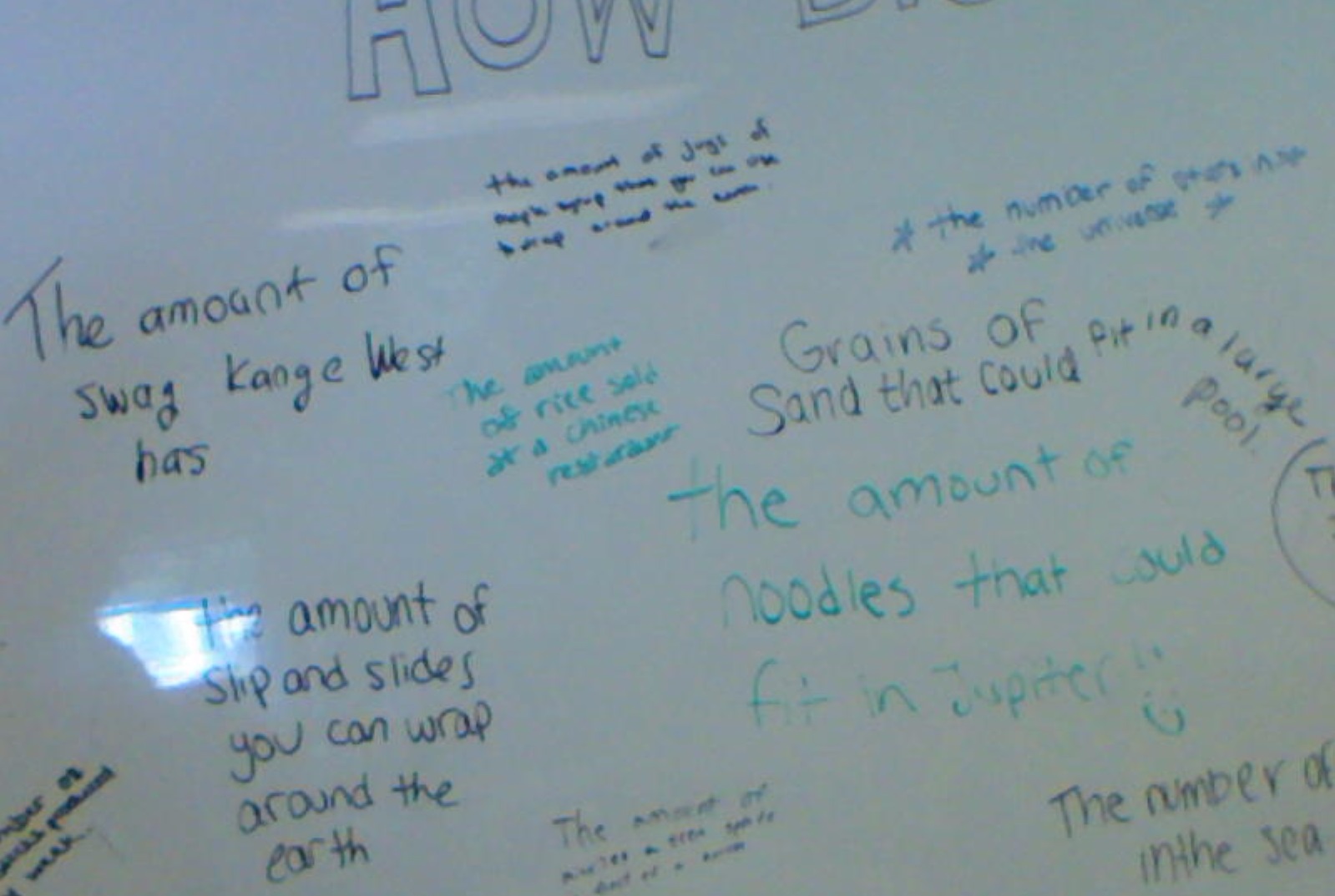 But just HOW big is this number?  To get students thinking, I asked them to consider what a quantity that big could represent, being as creative (within reason) as they like. Some of the responses were awesome fun.  Did you know Kanye had THAT much swag?